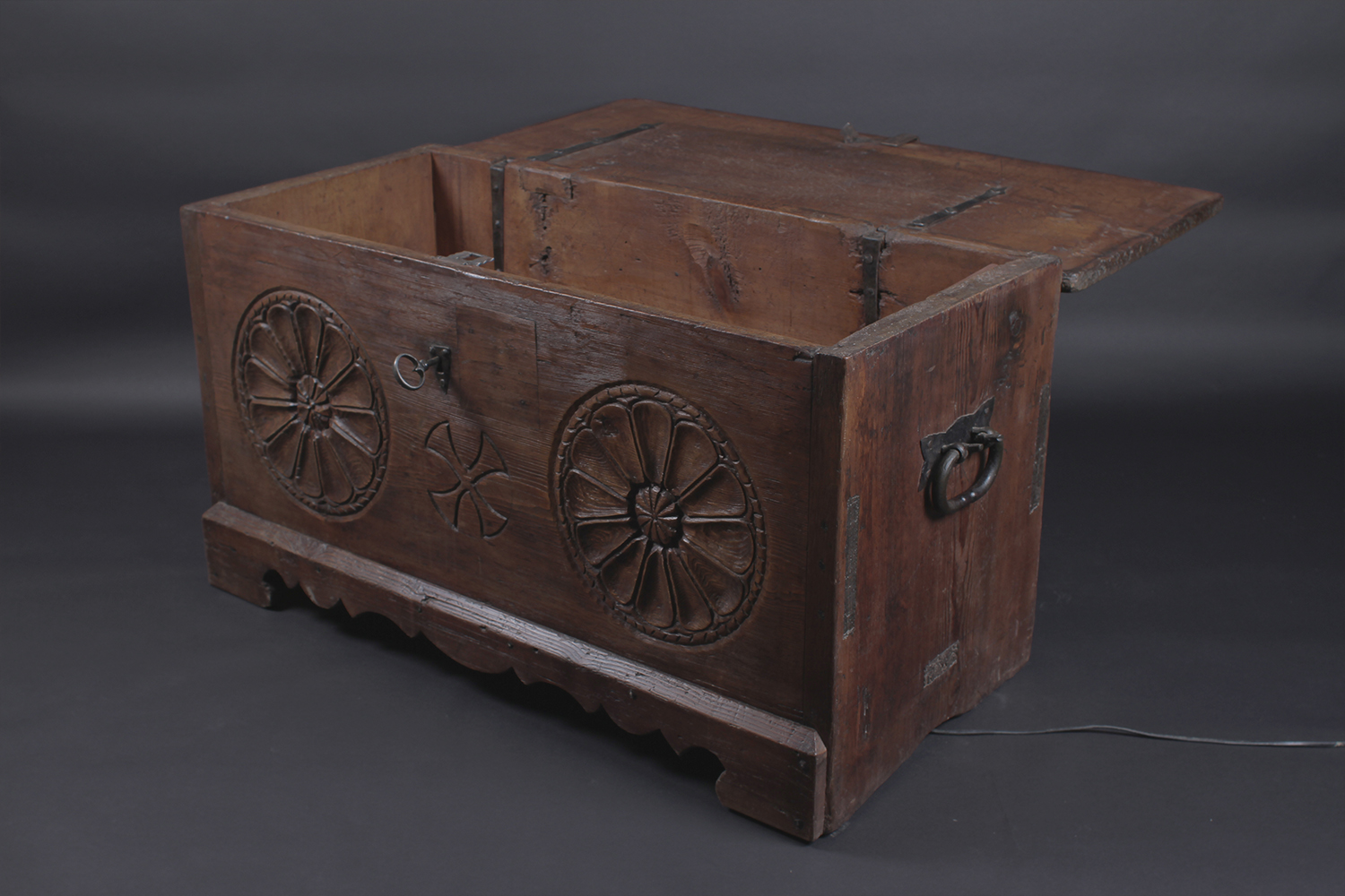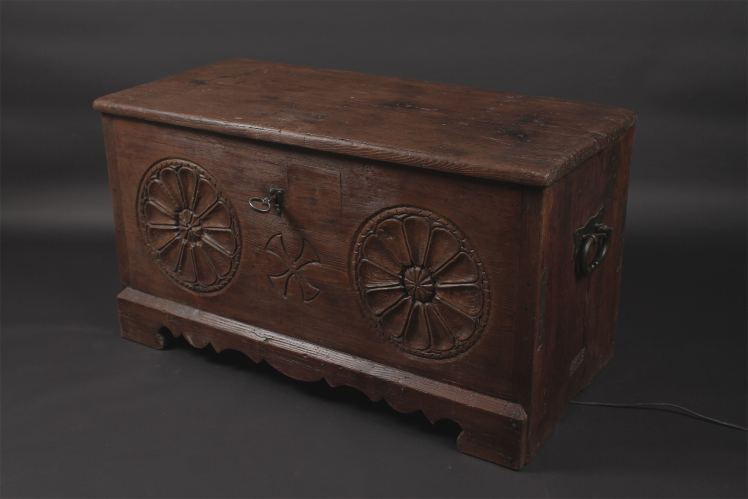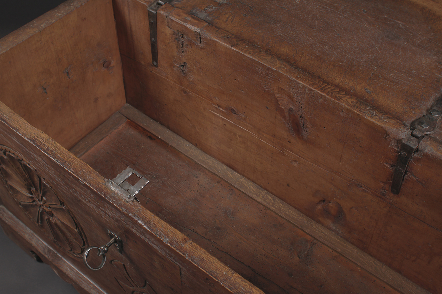 18e siècle Deux rosaces sculptées et une croix au centre Serrure ancienne à mâchoire, ferrures d'origine Installation d'un éclairage au fond du coffre Dim: L115 x P51 x H62 cm VENDU