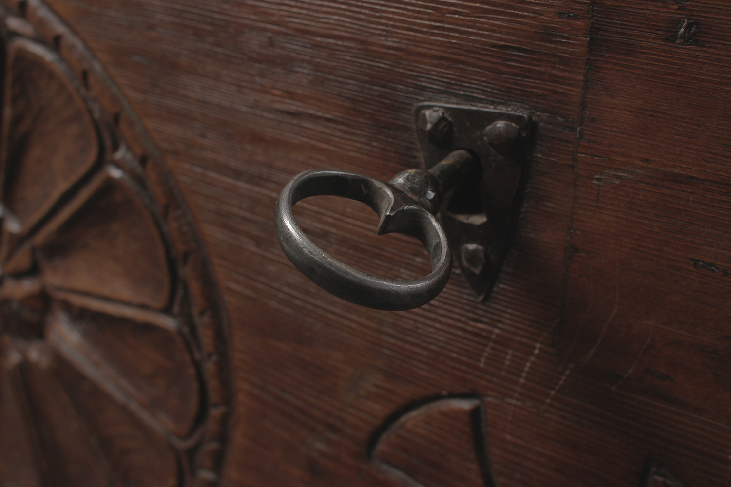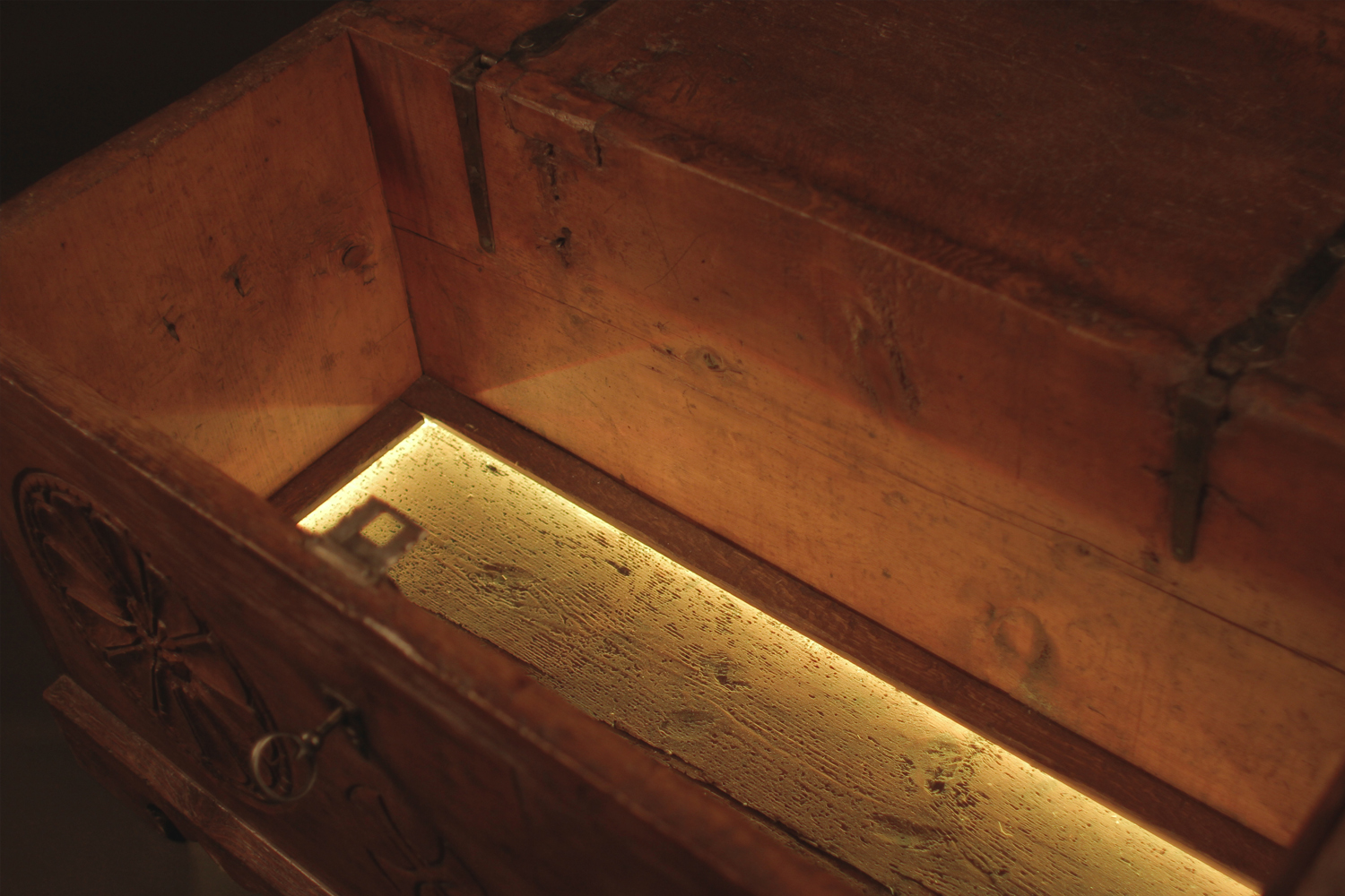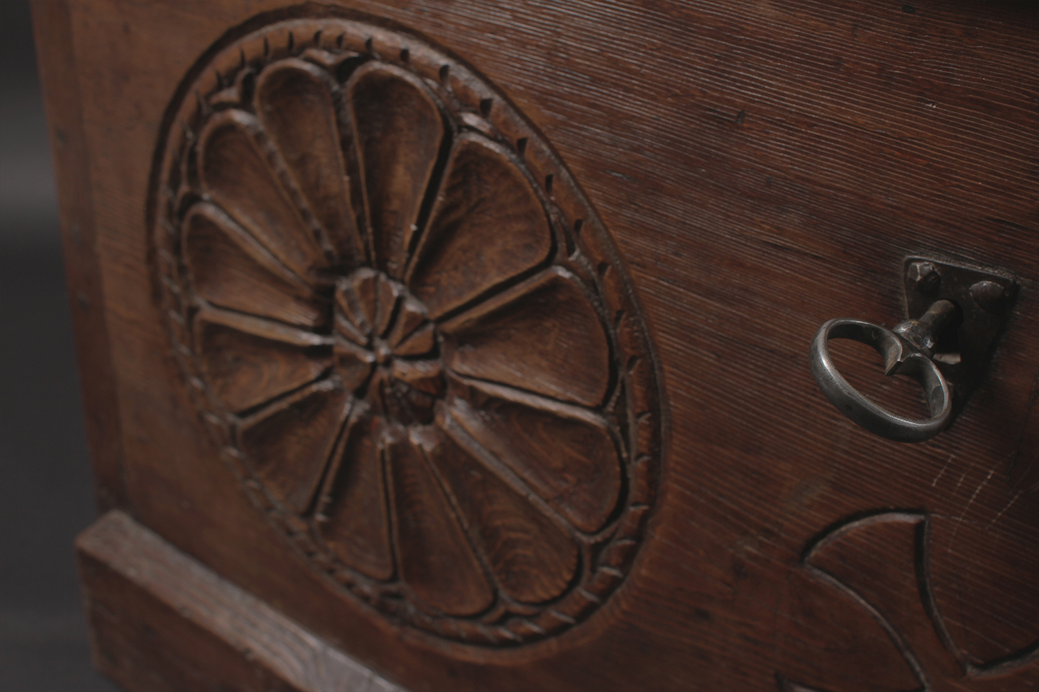 18e siècle Deux rosaces sculptées et une croix au centre Serrure ancienne à mâchoire, ferrures d'origine Installation d'un éclairage au fond du coffre Dim: L115 x P51 x H62 cm VENDU