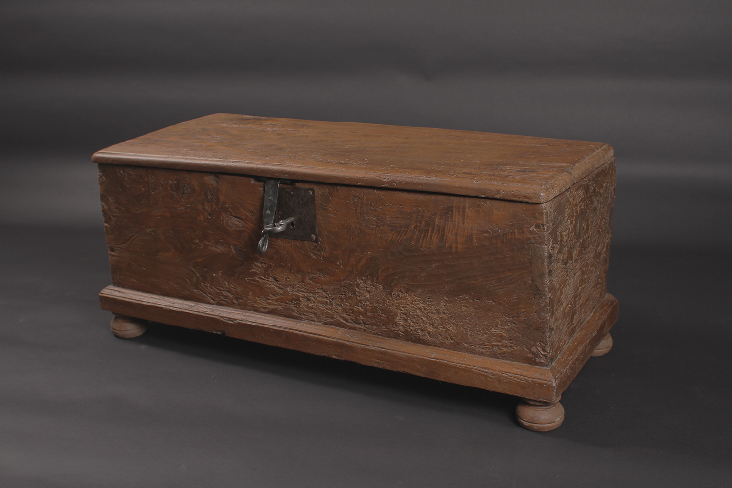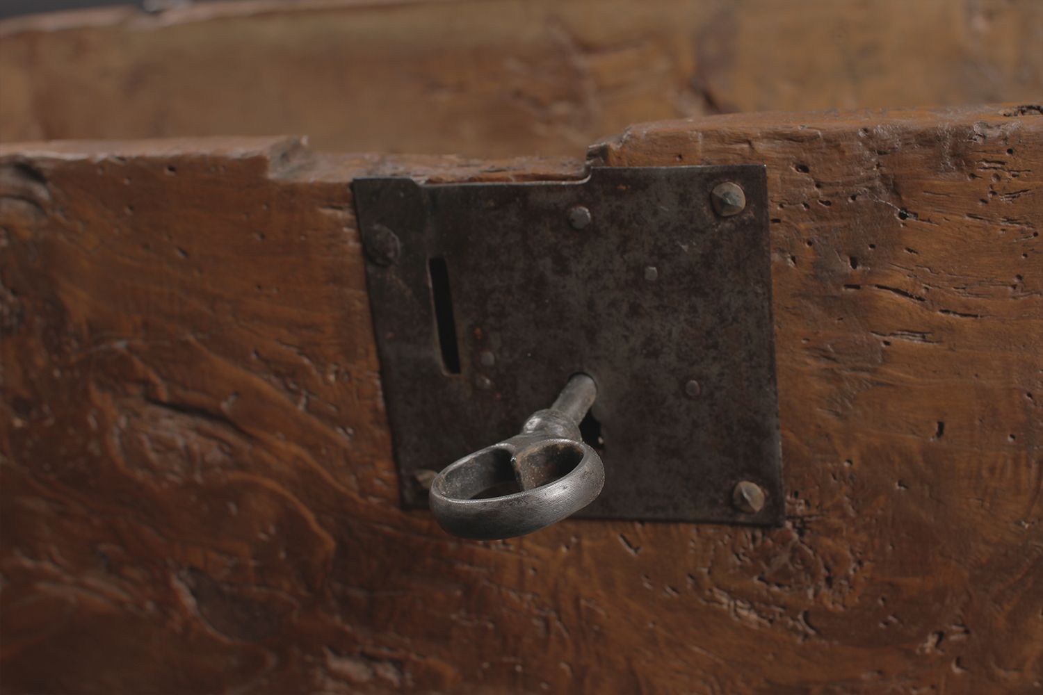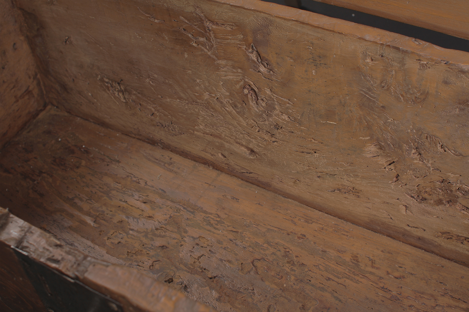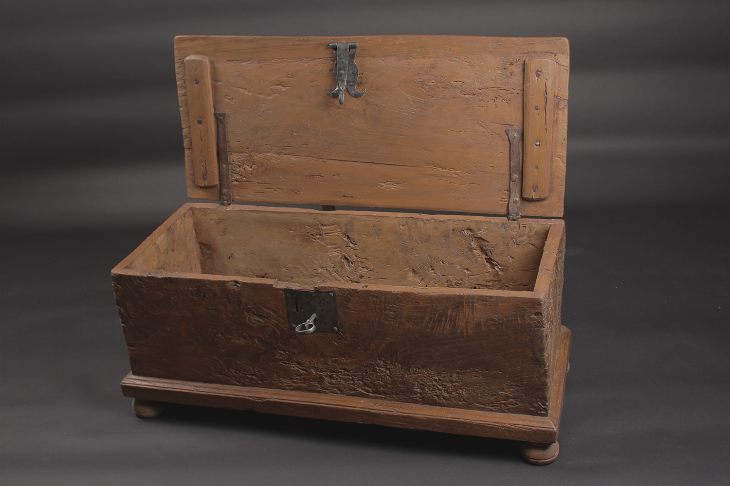 Petit coffre en ronce d’orme. 17e siècle. Très vieille empreinte de serrure. Fermoir à moustaches. Clous anciens à 4 pans. Raves ajoutées ultérieurement. Etat d'origine, entièrement restauré. Prix: 2200.-