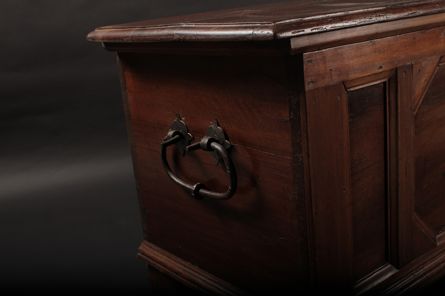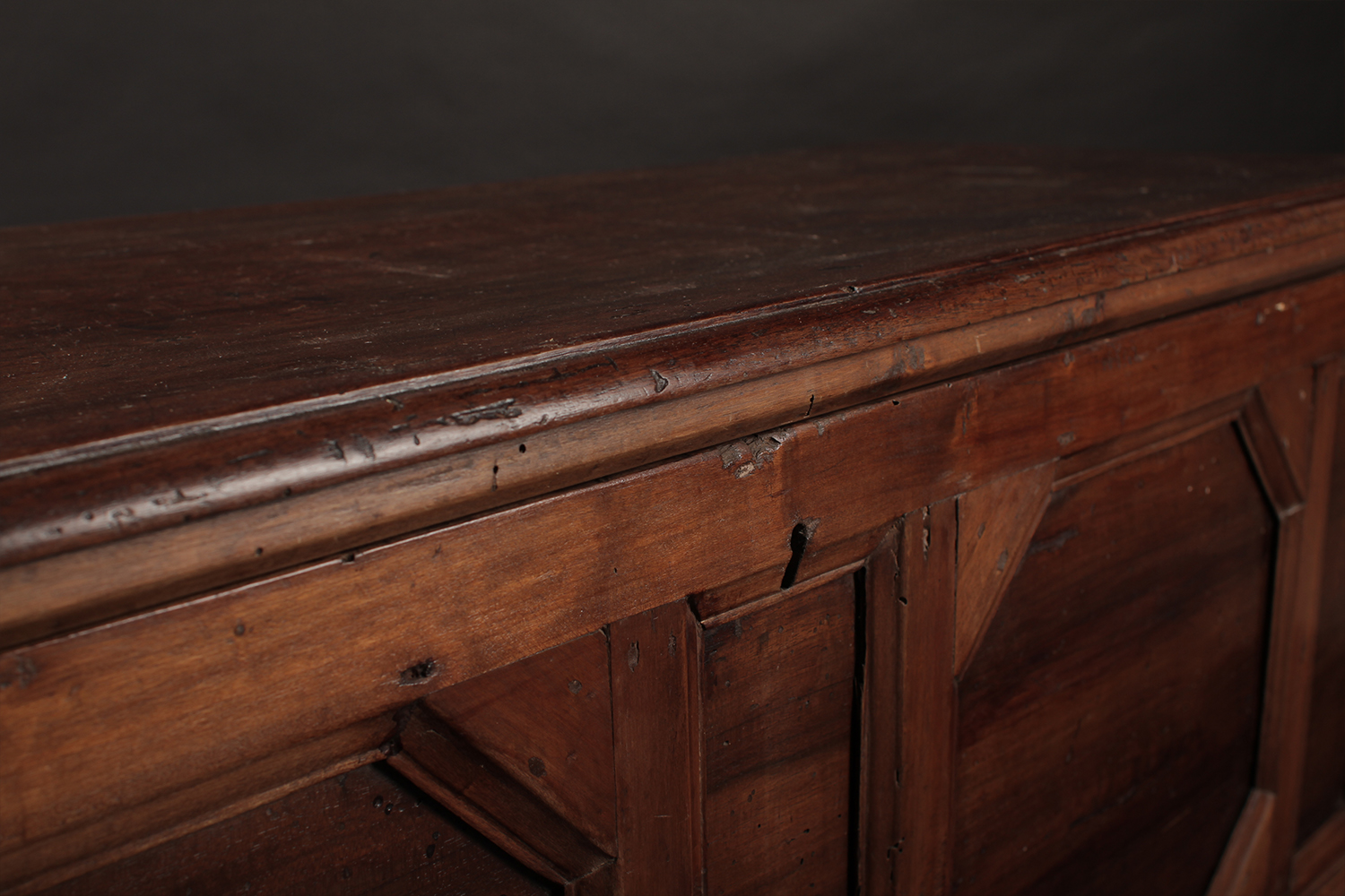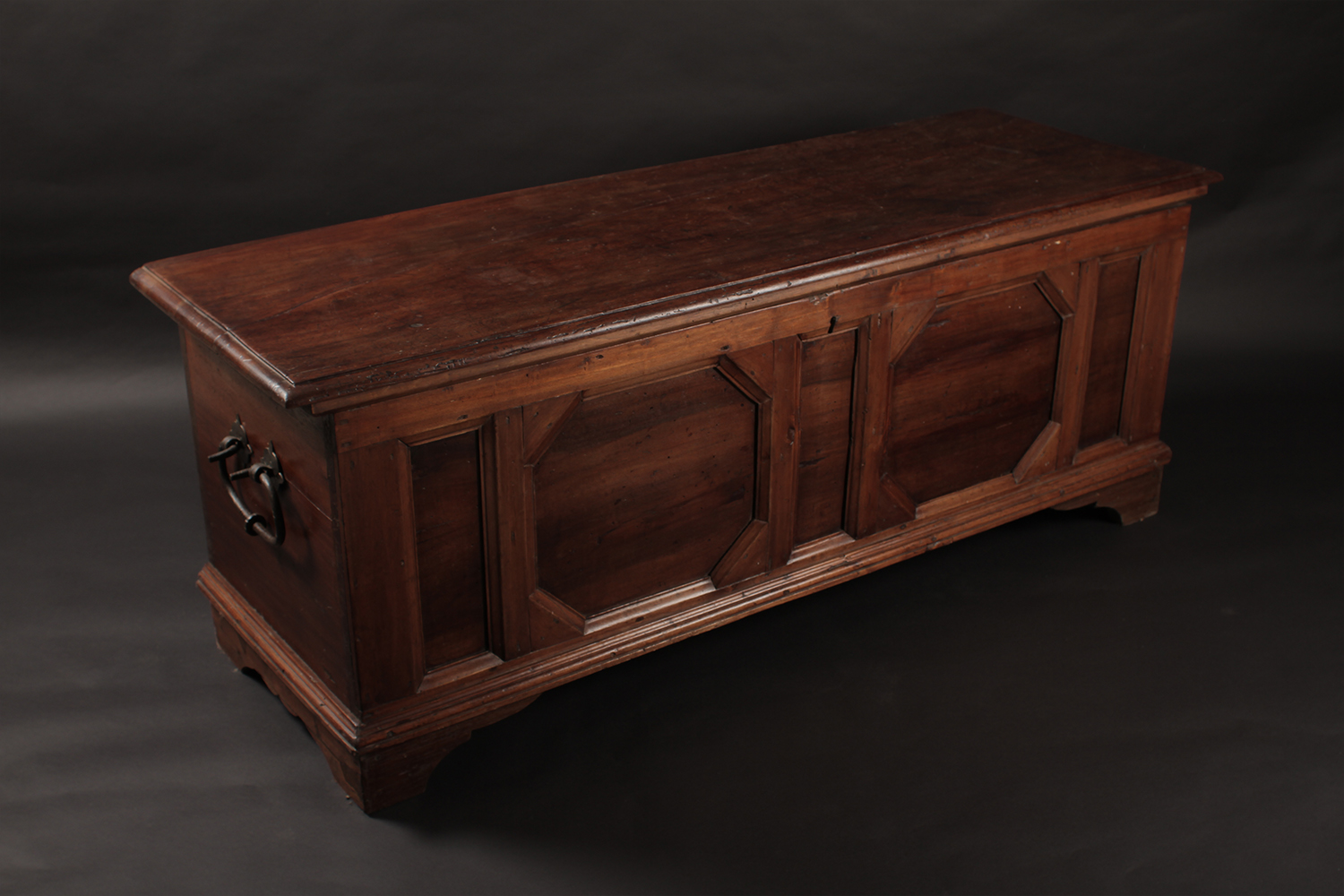19e siècle En noyer Panneaux octogonaux et rectangulaires Patine ancienne Poignées anciennes en fer forgé Dim: L143 x P49 x H57 cm Prix: 970 CHF VENDU
