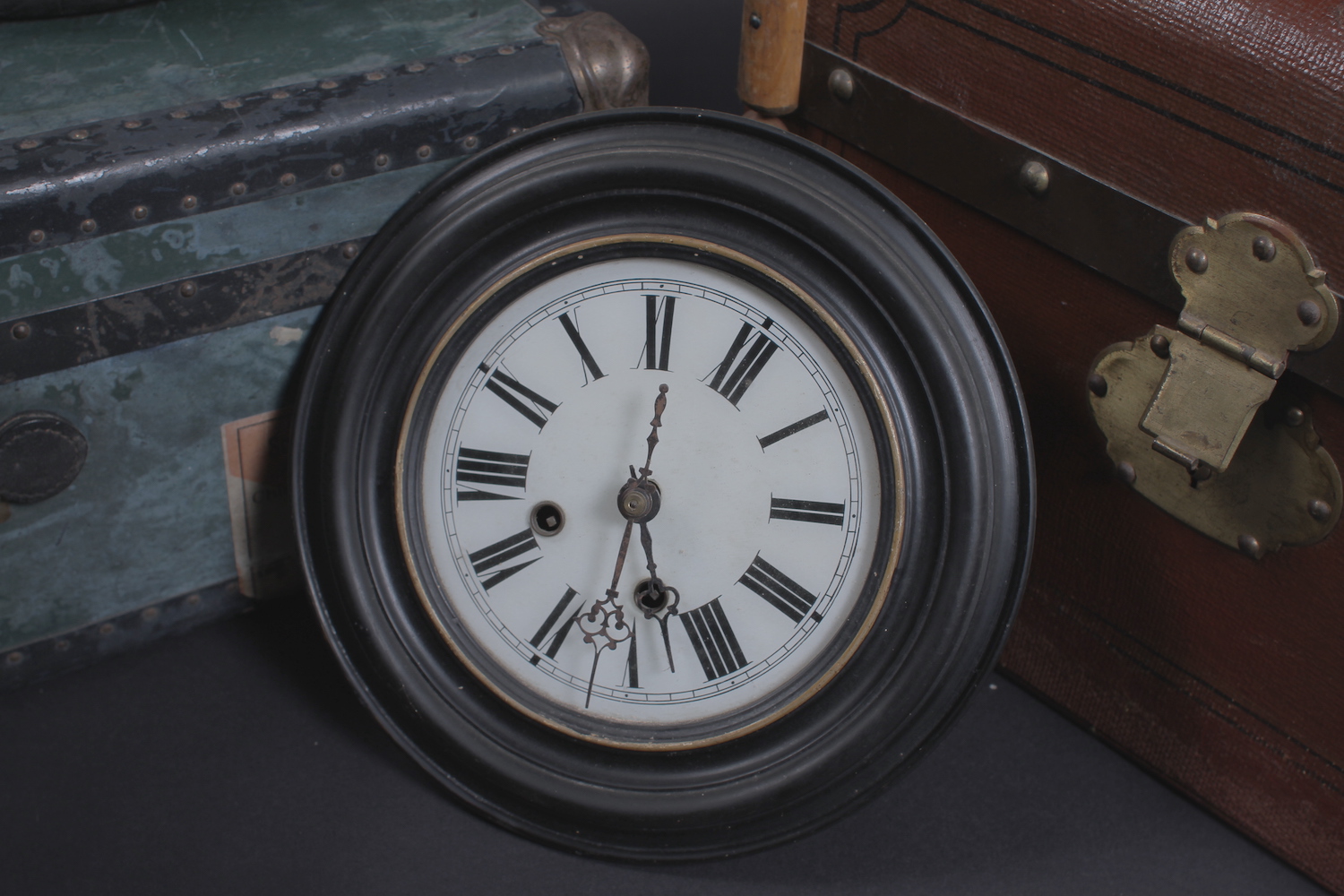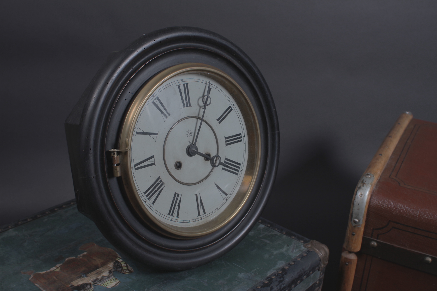 Horloge ronde " oeil de boeuf" Boîtier noir en bois, vitre en bon état Cadran à chiffres romains Dim: D 37 cm