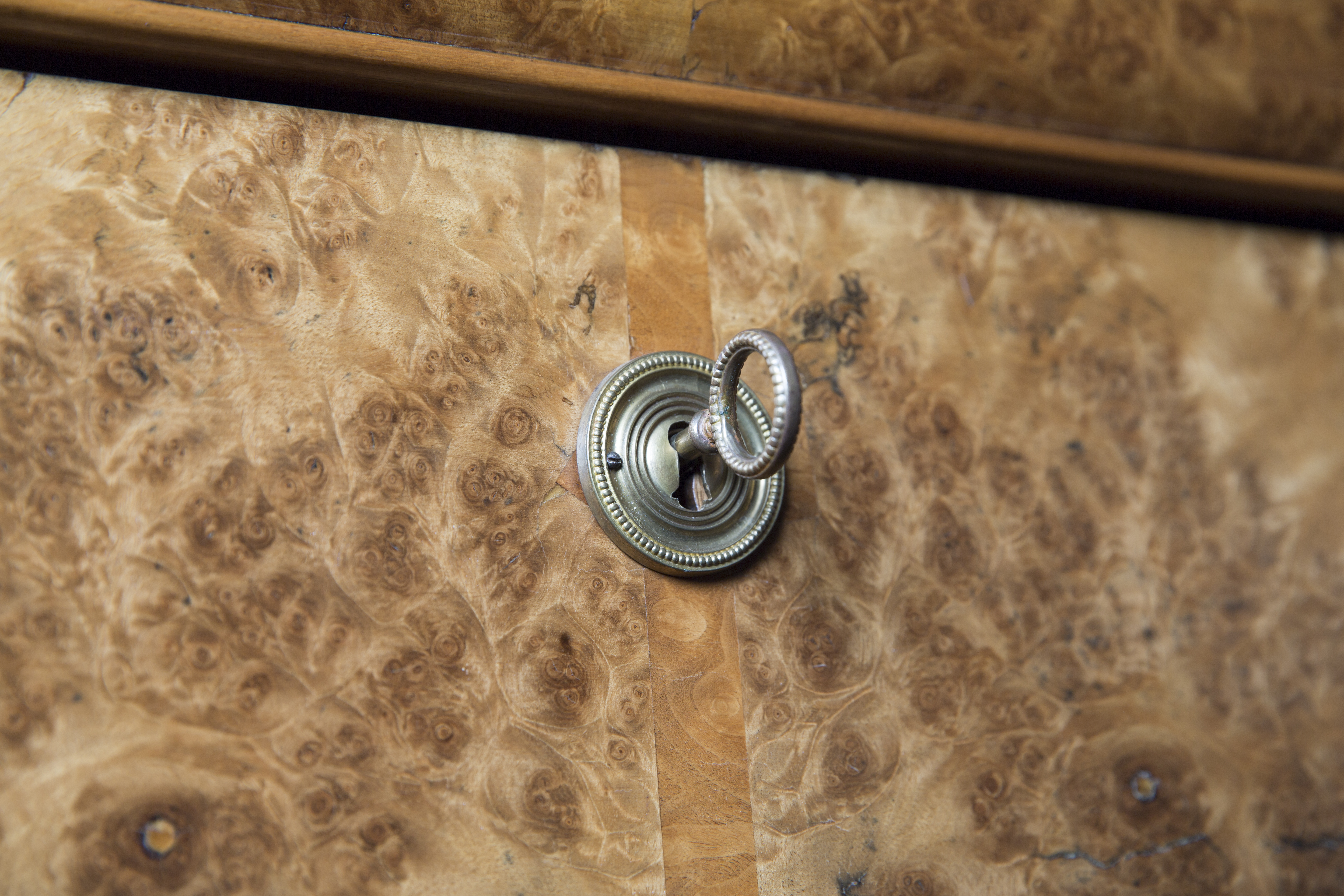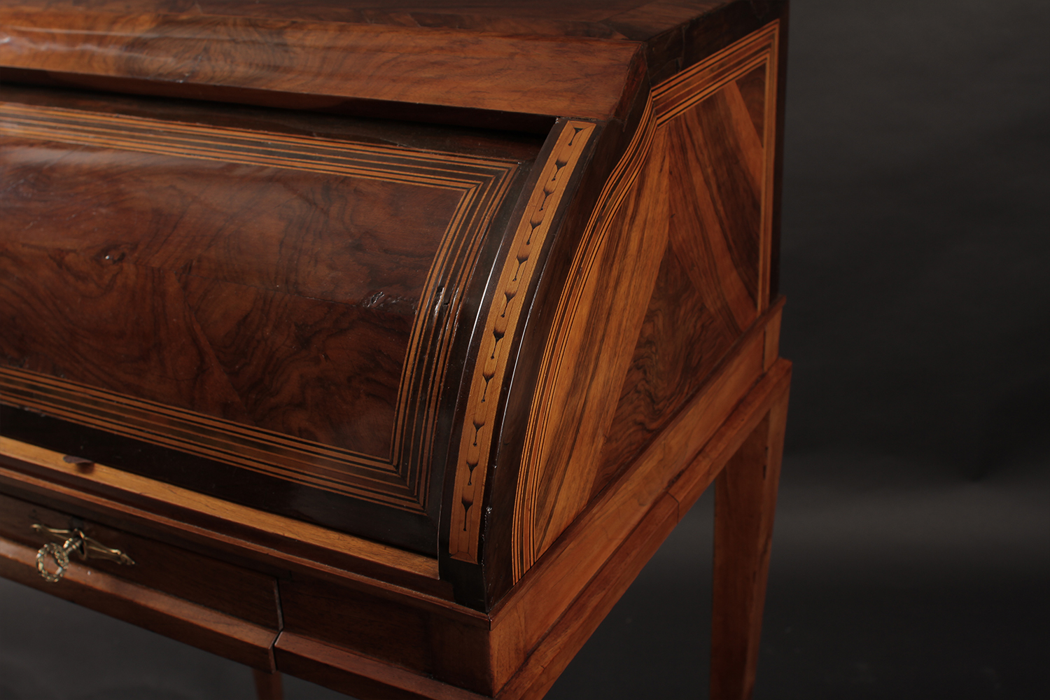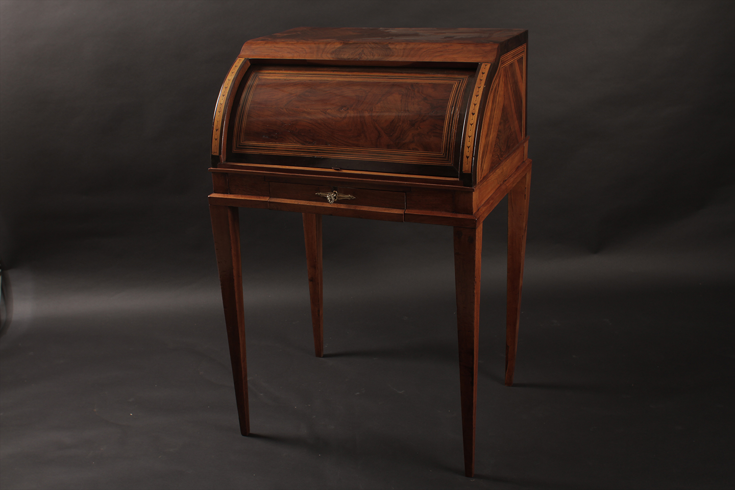 Petit bureau à cylindre Marqueté et finement plaqué Entièrement restauré Finition gomme laque au tampon Dim: L66 x P54 x H100 cm Prix: 980 CHF