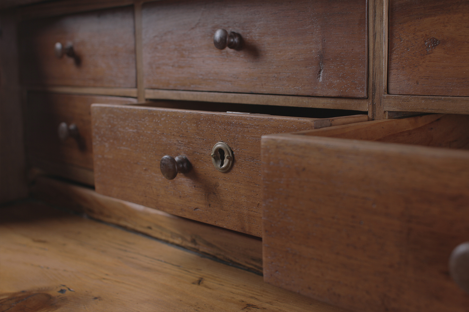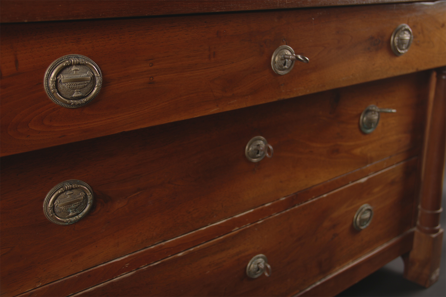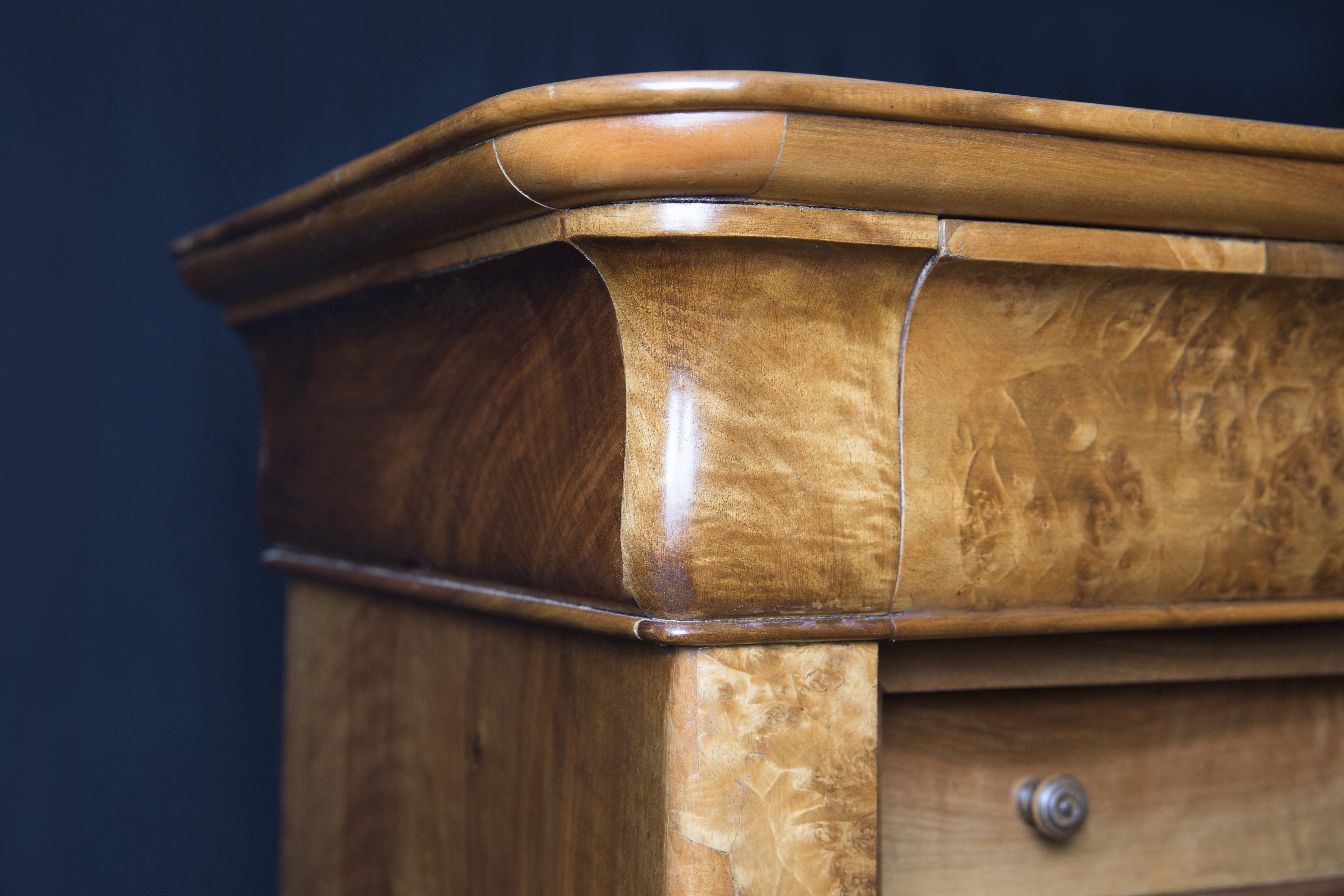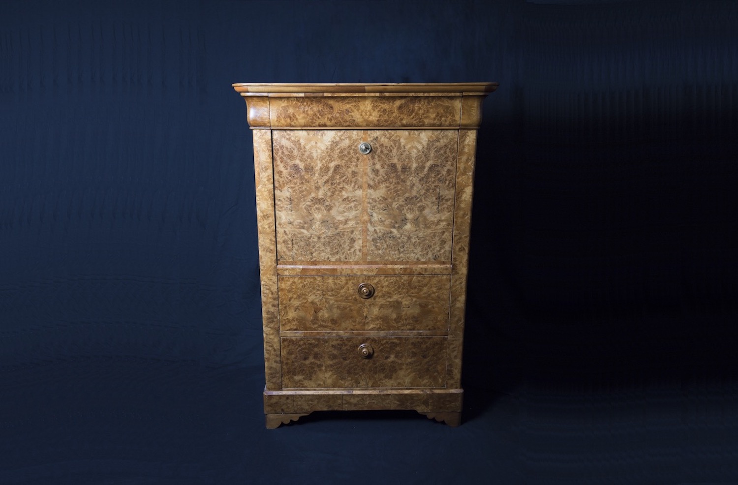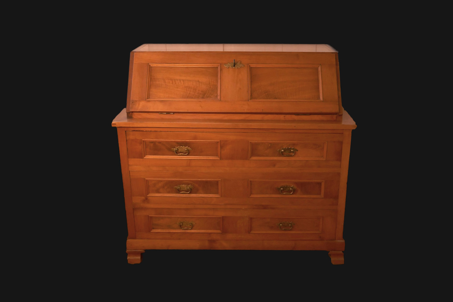 19 ème siècle 1850 Cerisier-sapin et noyer Assemblage très fin des tiroirs et géométrie complexe Prix : 1480.- Dim: L 115 x P 56 x H 110 cm