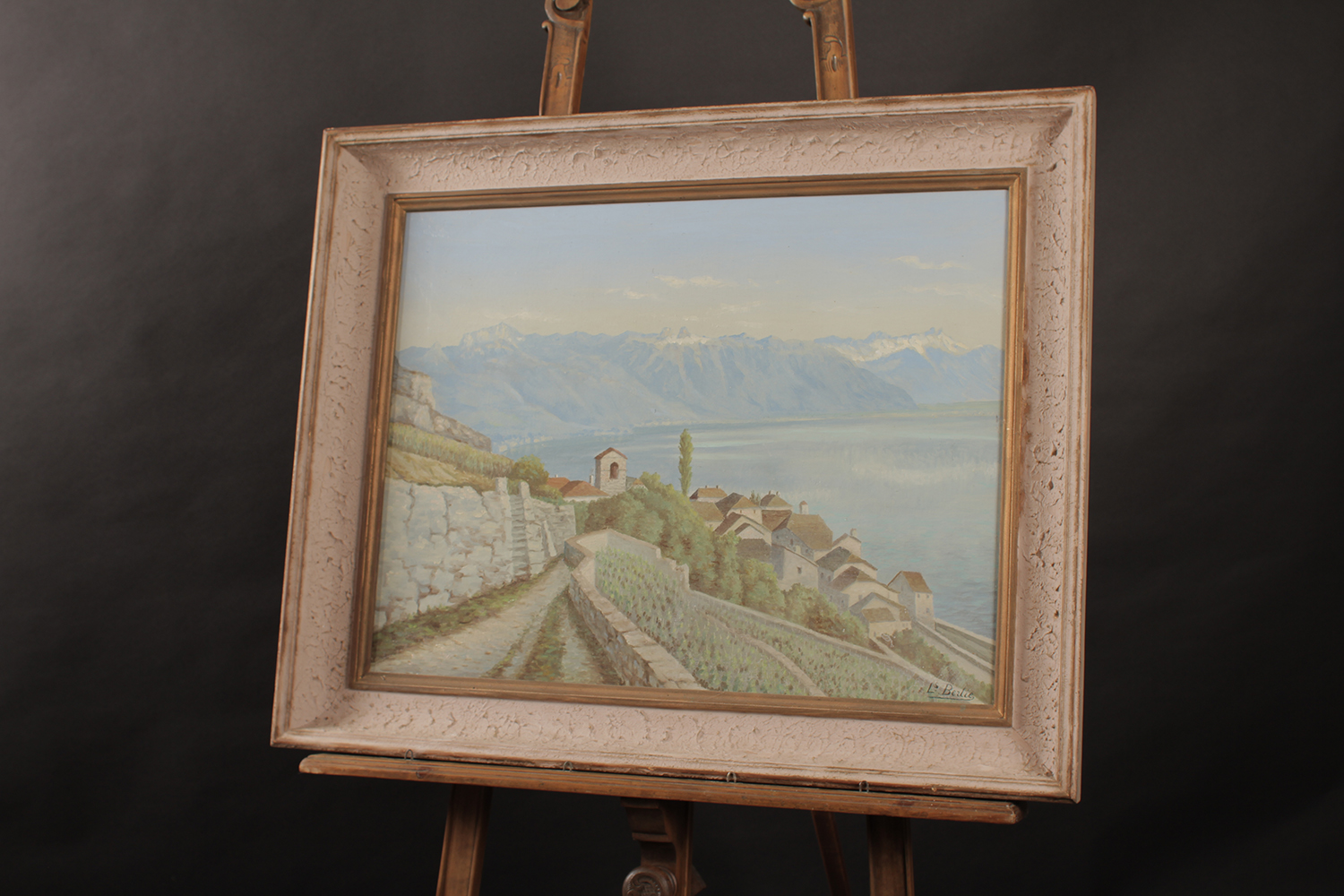 Peinture à l'huile Saint-Saphorin et le vignoble du Lavaux Au bord du lac Léman Signé Ls Berlie Dim: L80 x H65 cm VENDU